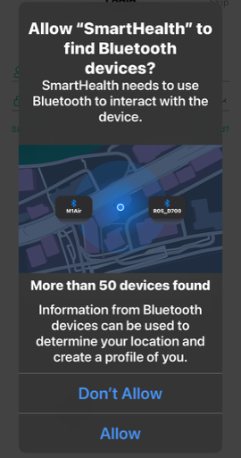 To connect your Bionic Ring with your Smartphone it is required to allow SmartHealth to find Bluetooth devices (the Ring uses Bluetooth to communicate with your smartphone).