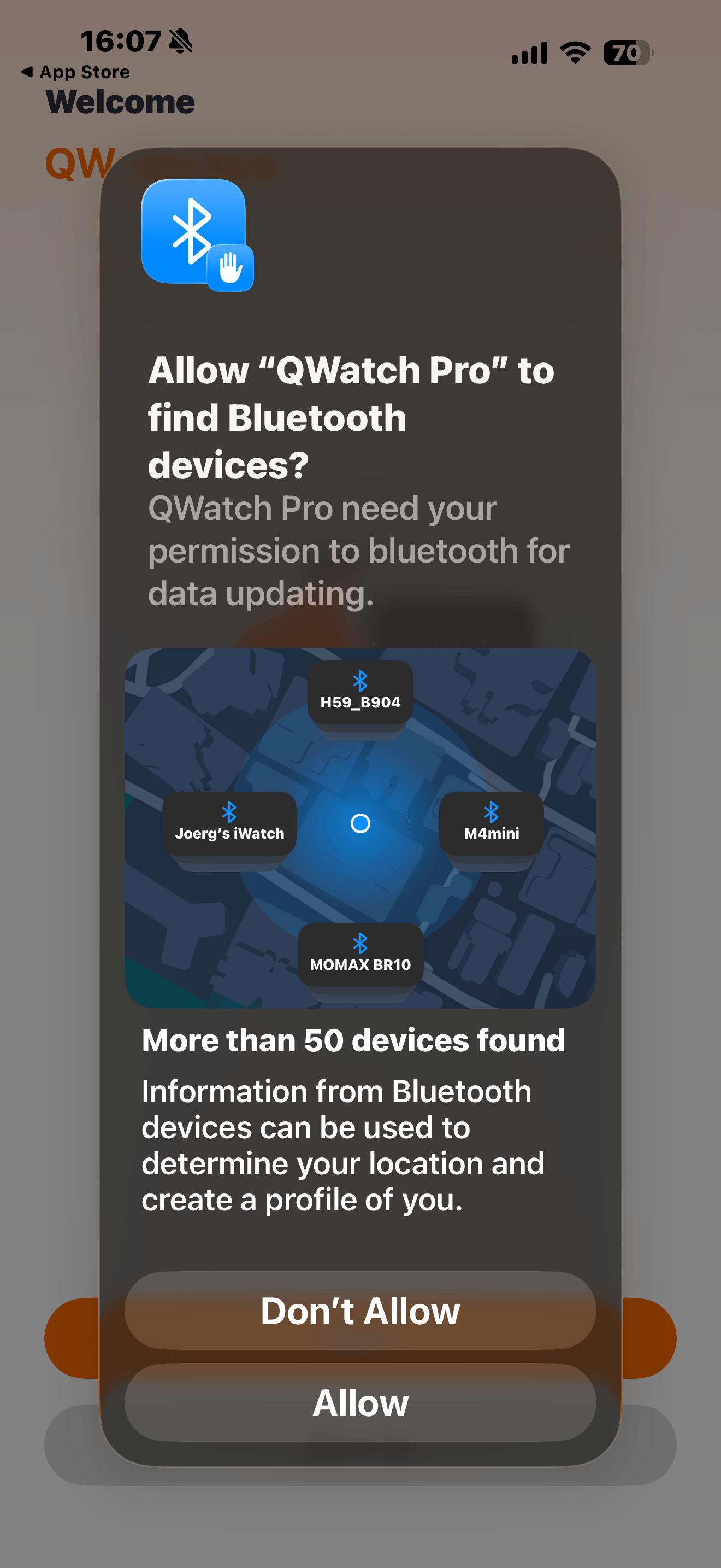 If you want to allow the QWatch Pro App to track your location to enable work-out related options, please press “Allow While Using App”. This is optional and allowing “location services” is not required for the basic functionality of the QWatch Pro App.