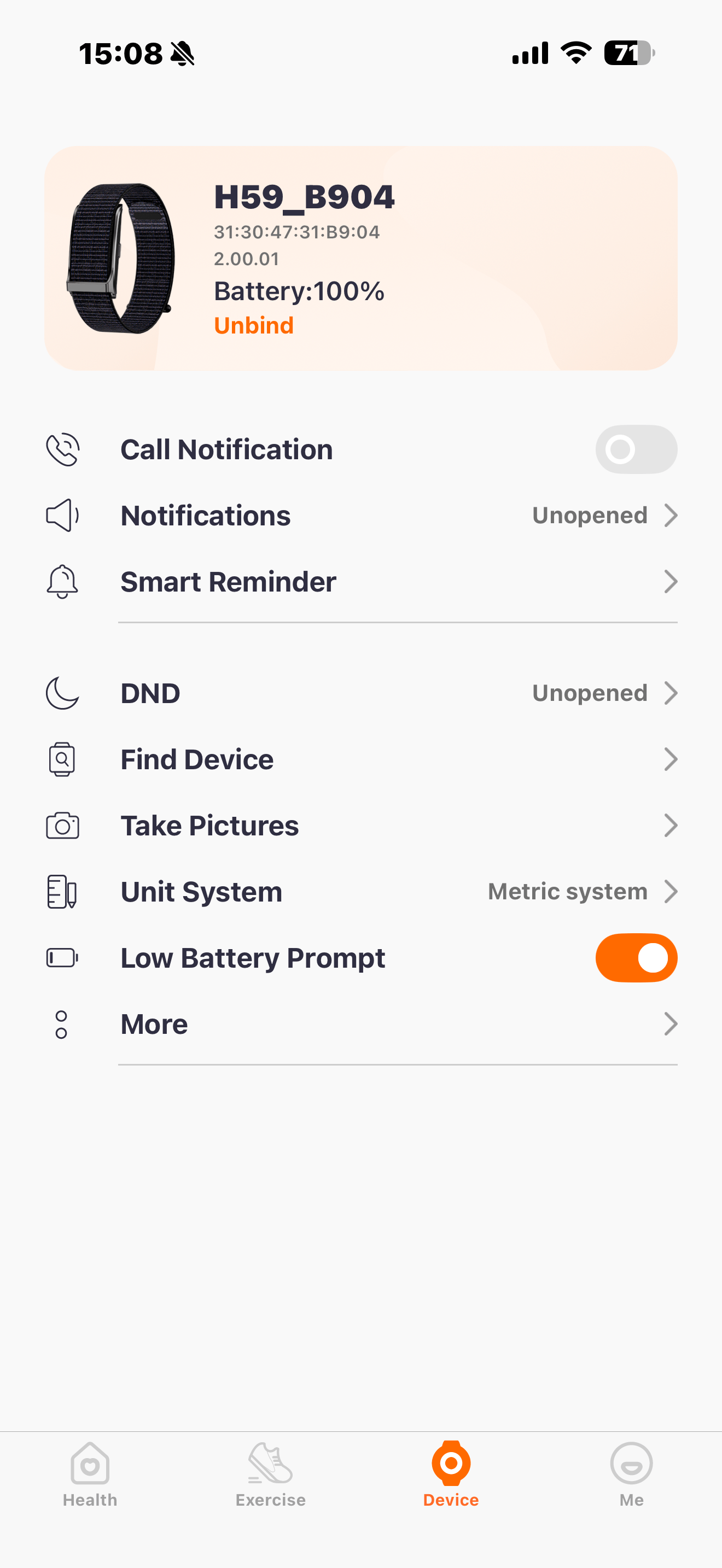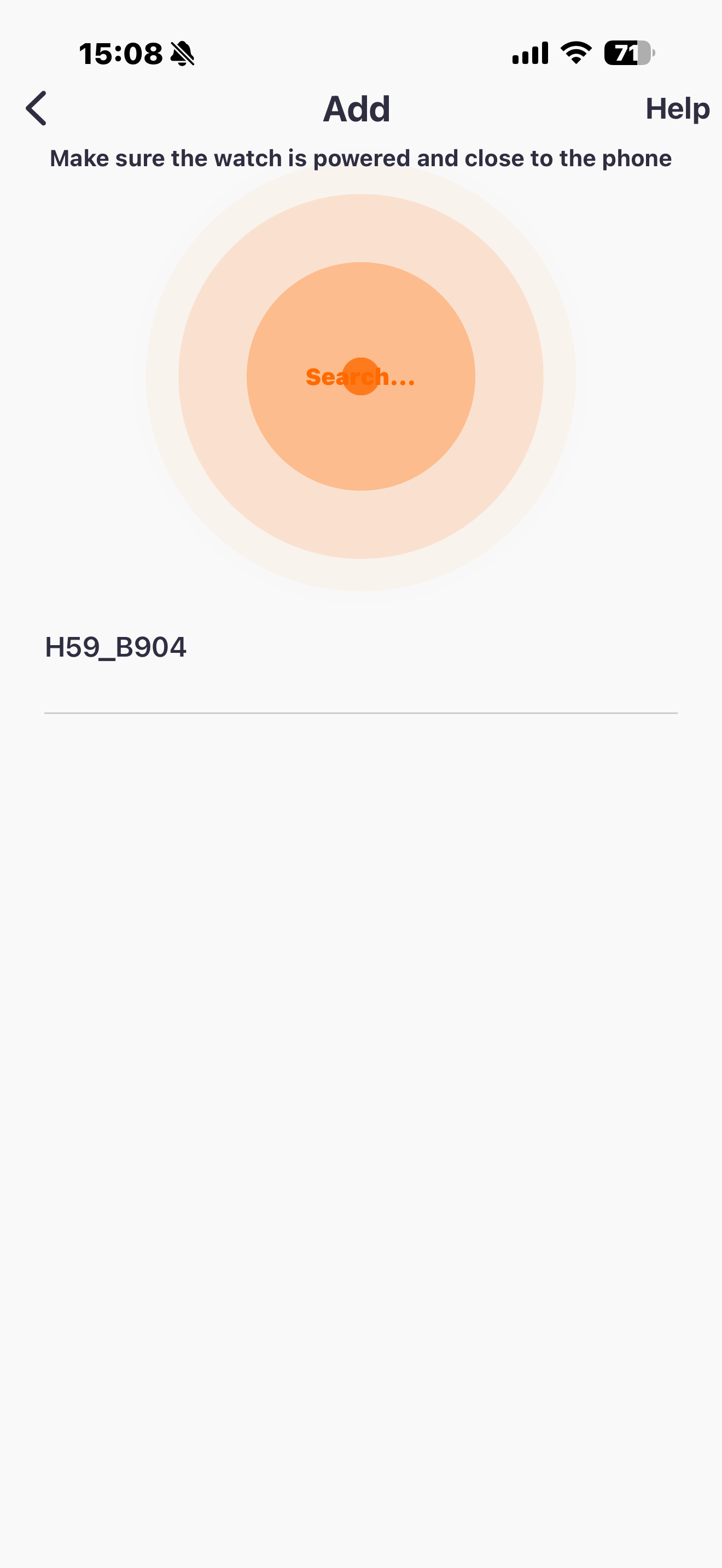Your Zenith Bionic Band will show up with its Product ID “H59” and the last 4 characters of its MAC address (here: “B904”). Note: The MAC address of your band will be different. Please press "H59_xxxx" to connect your Zenith Bionic Band with the QWatch Pro App.