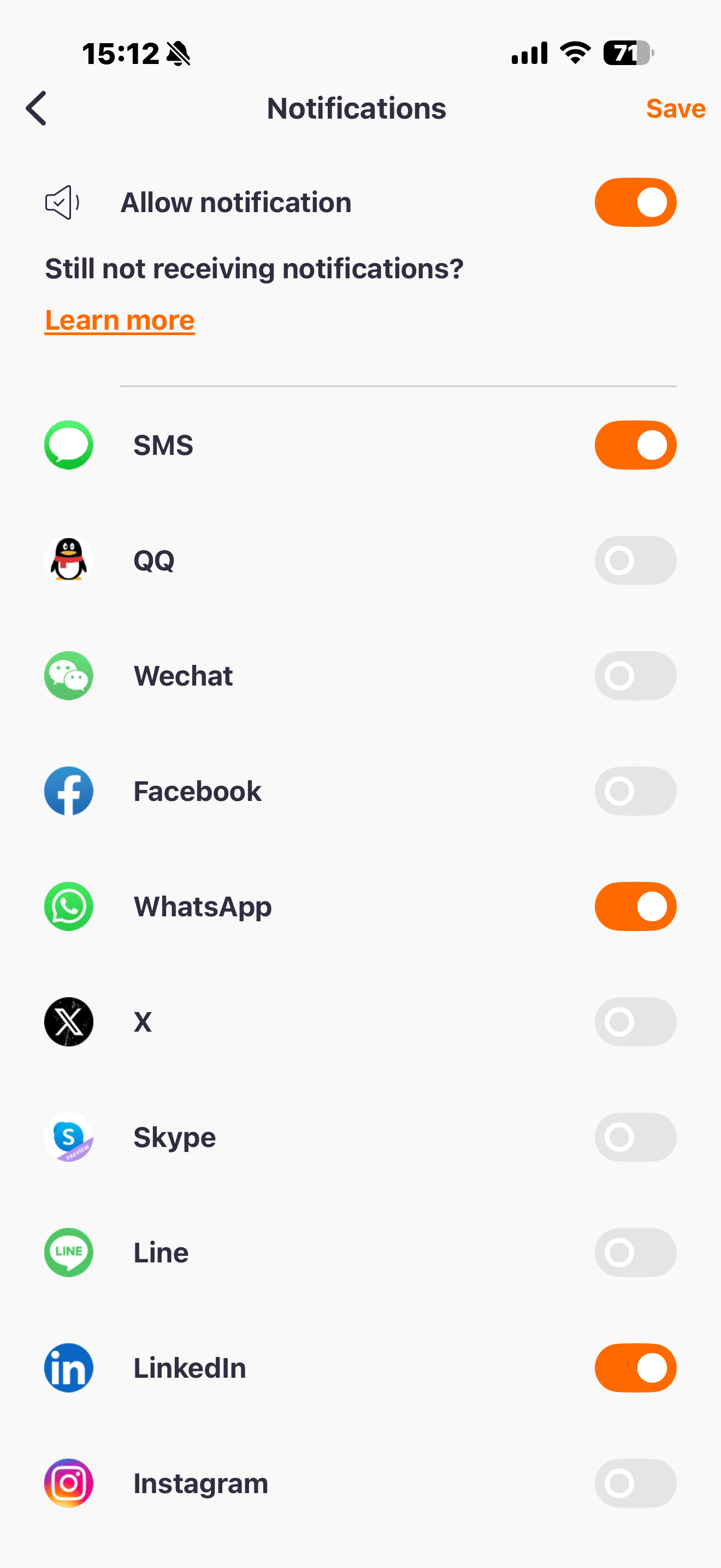 Notification options for many popular apps are available.